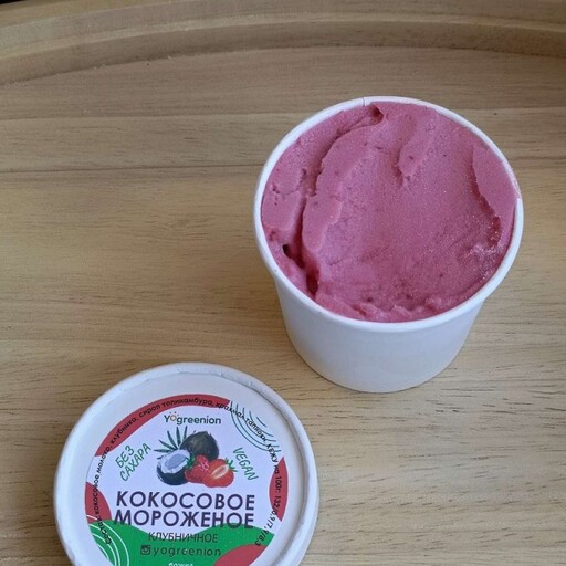 Мороженое из кокосового молока со вкусом клубники Состав: кокосовое молоко, крахмал тапиоки, клубника, сироп топинамбура, соль. КБЖУ на 100 гр: 132/0,9/7,9/8,3