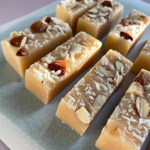 Состав: Сливки 34%, кокосовая паста, сахар, глюкозный сироп, масло сливочное 82,5%, кокосовая стружка (сверху), рубленый миндаль (сверху) Пищевая ценность на 100гр: КБЖУ: 420/3,5//24,7/46